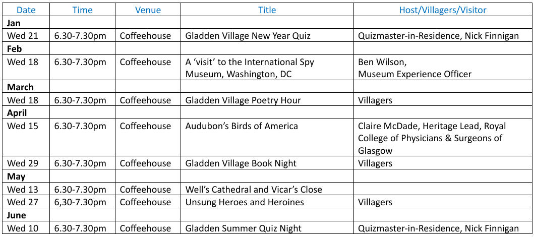 Gladden Coffeehouse events are quite simply a wonderful way to escape, explore and e-socialise, from the comfort and convenience of your home.